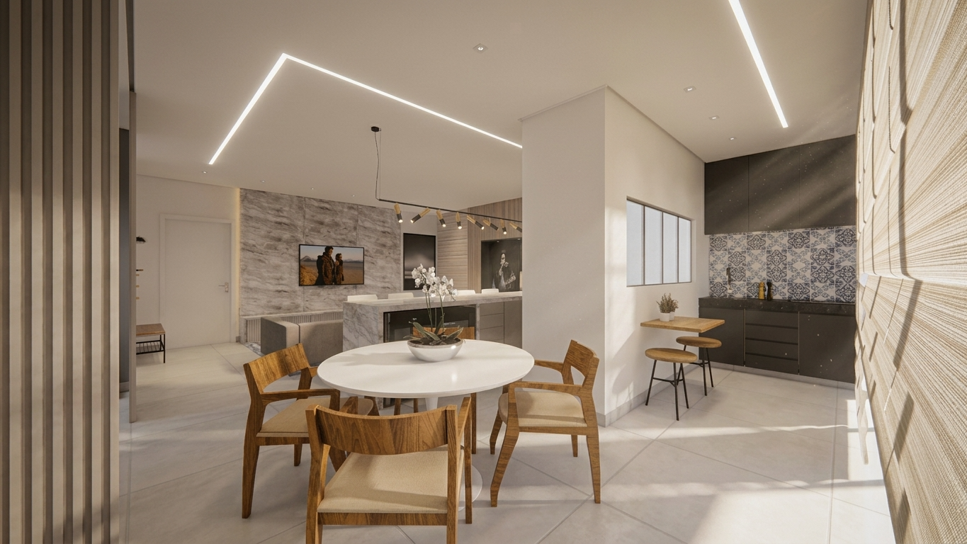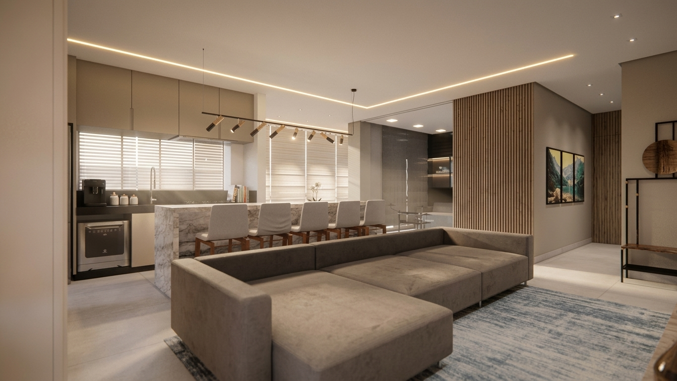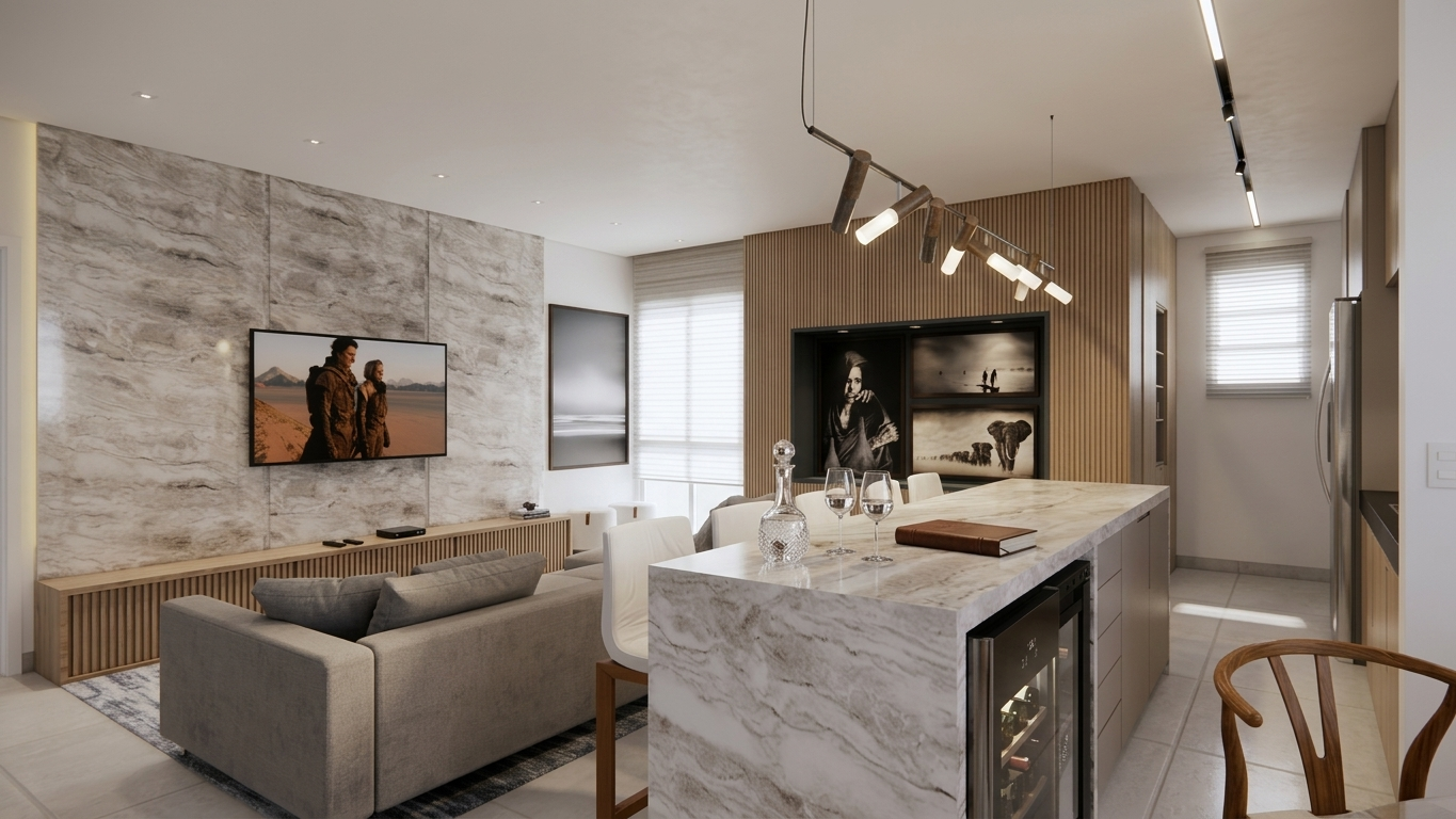 O Apartamento Essence foi projetado para um jovem casal que através da música reúne a família! A premissa do projeto foi criar um espaço reversível que sirva de estúdio musical, escritório, quarto de visitas e que, ainda, integre aos ambientes comuns. A solução adotada foi um painel acústico com portas de correr que permite a flexibilização destes espaços. Os nobres materiais utilizados conferem elegância e exclusividade: para a TV, painel e rack em Pedra Natural Laca, a marcenaria cria claras tonalidades fendi e amadeirado que em momentos apropriados contrasta com o cinza.