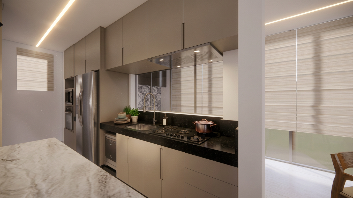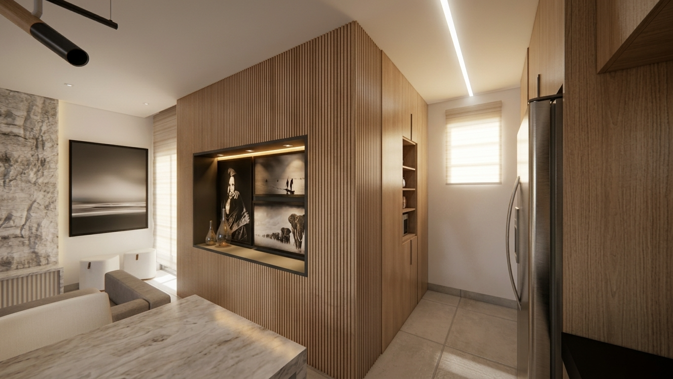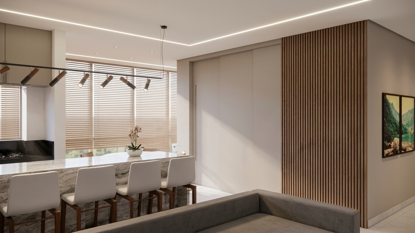 O Apartamento Essence foi projetado para um jovem casal que através da música reúne a família! A premissa do projeto foi criar um espaço reversível que sirva de estúdio musical, escritório, quarto de visitas e que, ainda, integre aos ambientes comuns. A solução adotada foi um painel acústico com portas de correr que permite a flexibilização destes espaços. Os nobres materiais utilizados conferem elegância e exclusividade: para a TV, painel e rack em Pedra Natural Laca, a marcenaria cria claras tonalidades fendi e amadeirado que em momentos apropriados contrasta com o cinza.