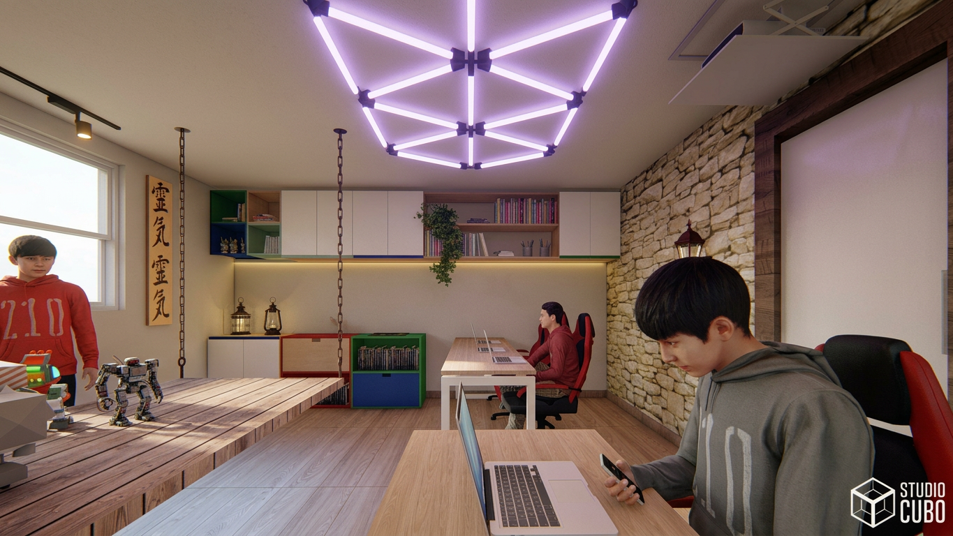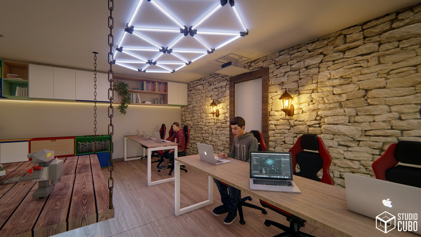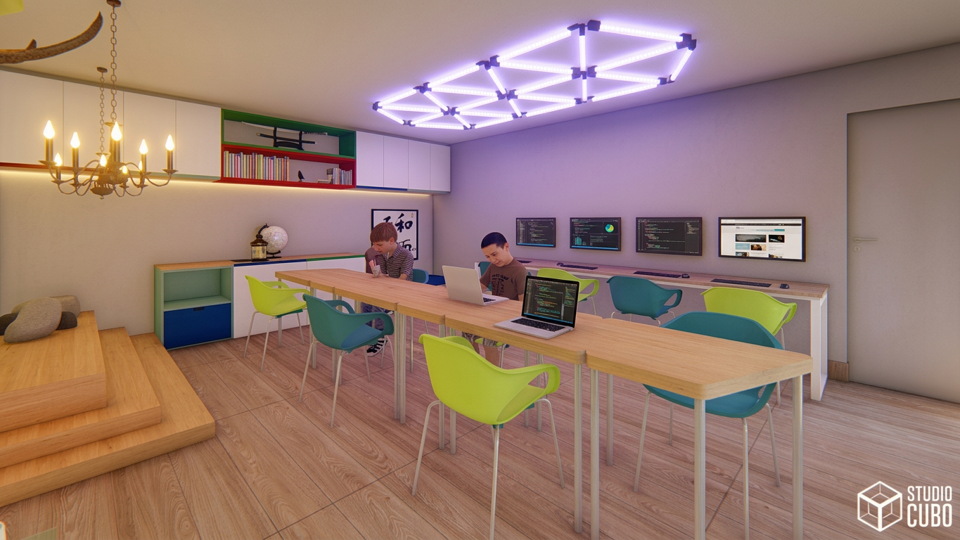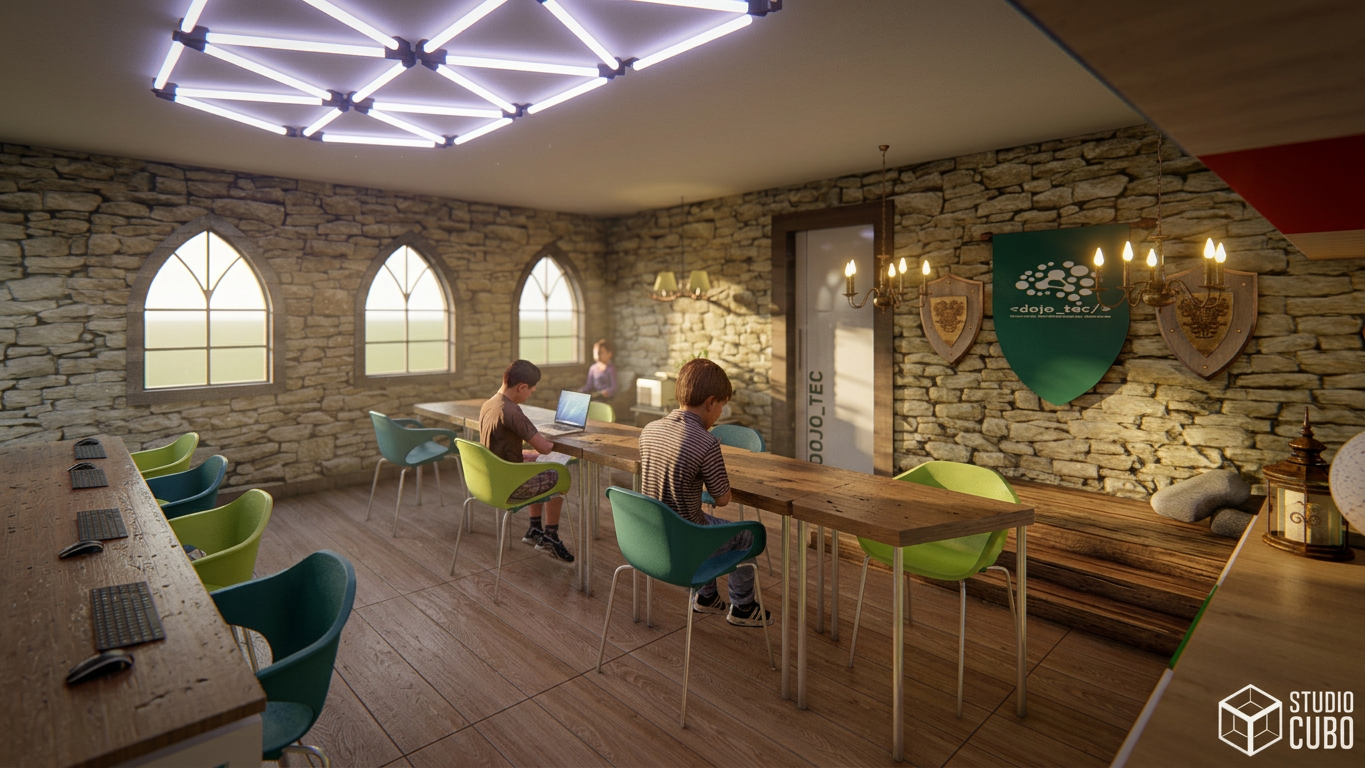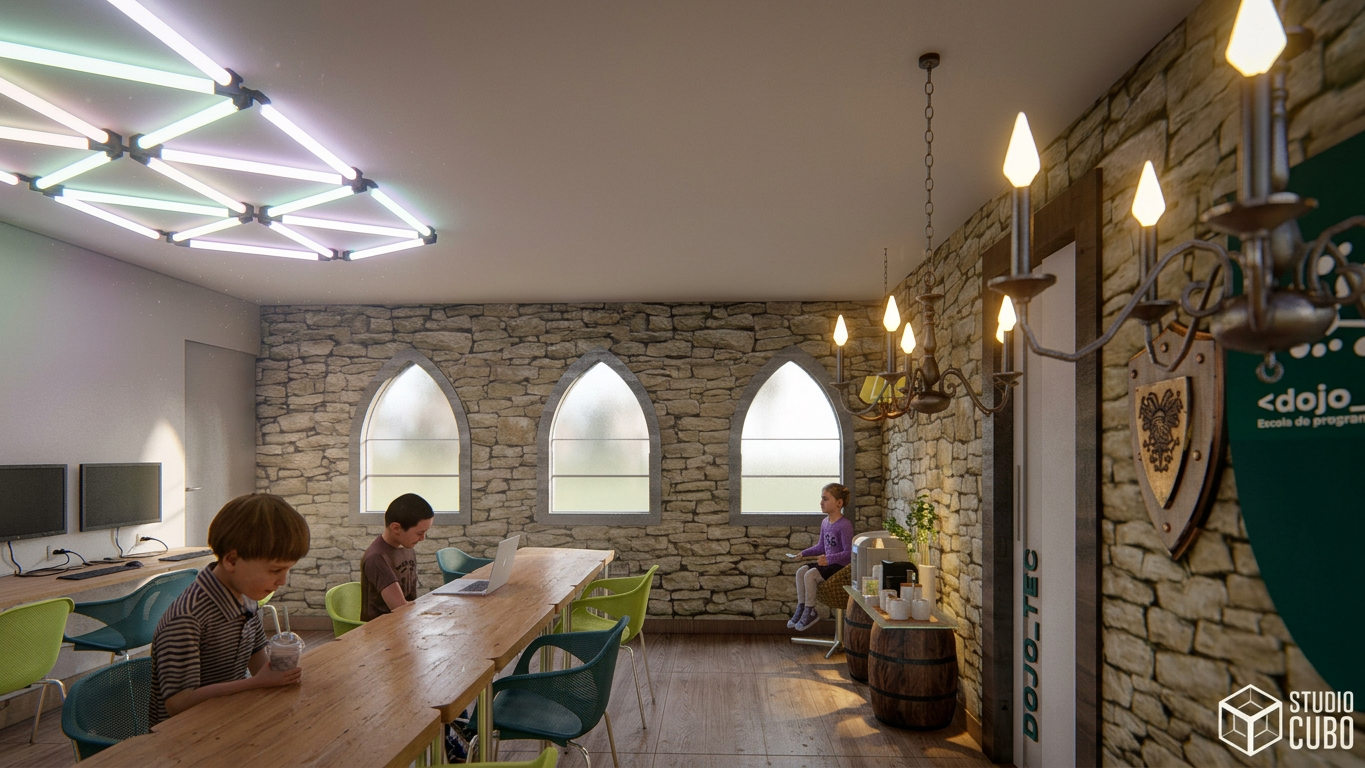 Projeto de Reforma para a Escola de Robótica Dojo Tec em São João Del Rei, MG. Consiste em gerar uma cenografia medieval imersiva para os alunos que diariamente aprendem sobre programação, robótica e informática. O espaço contempla Arena de Disputa entre os Robôs (uma plataforma automatizada que desce do forro), biblioteca e sala de aula, através de uma linguagem divertida e interativa.