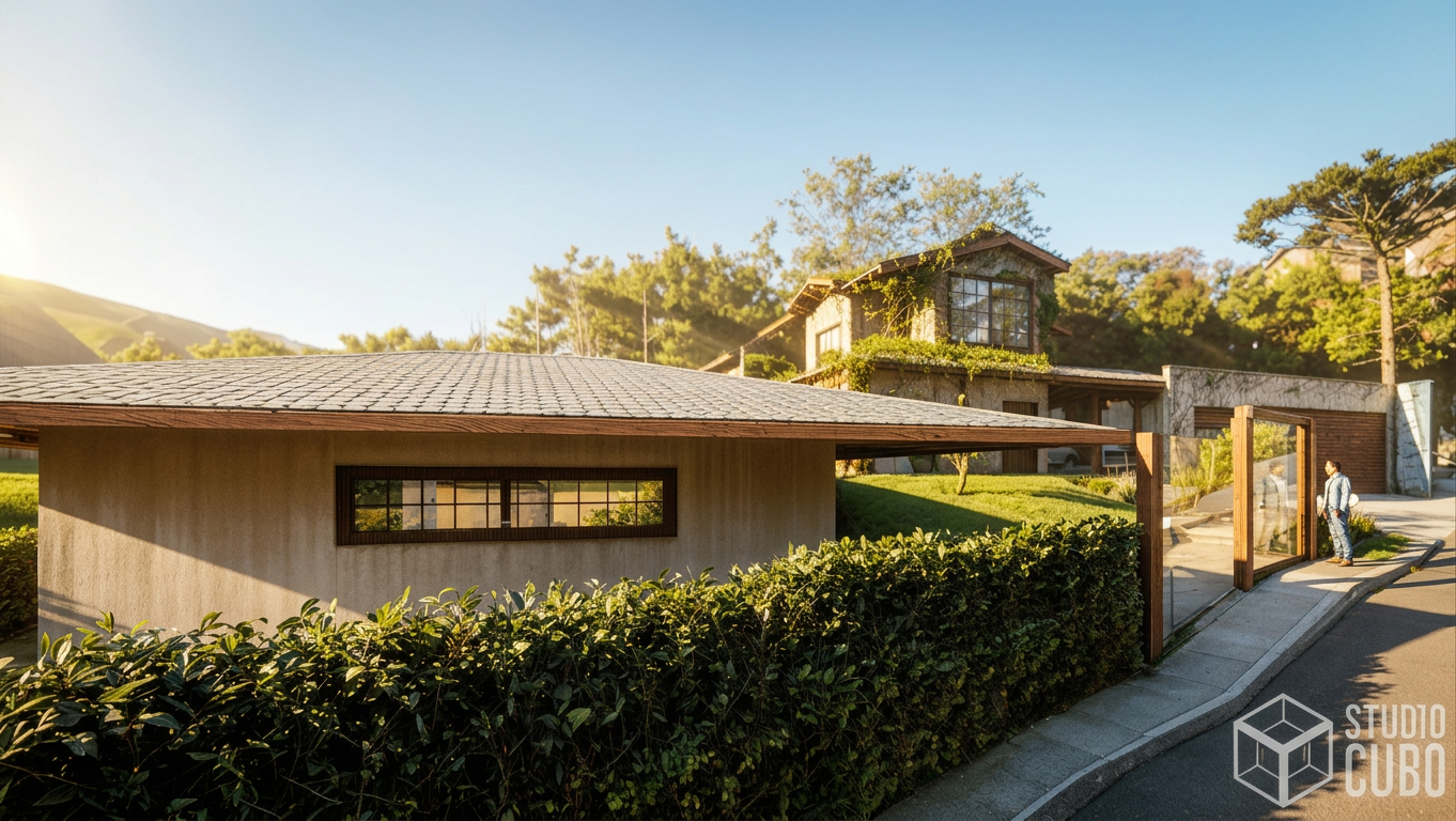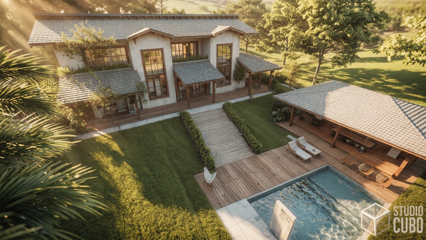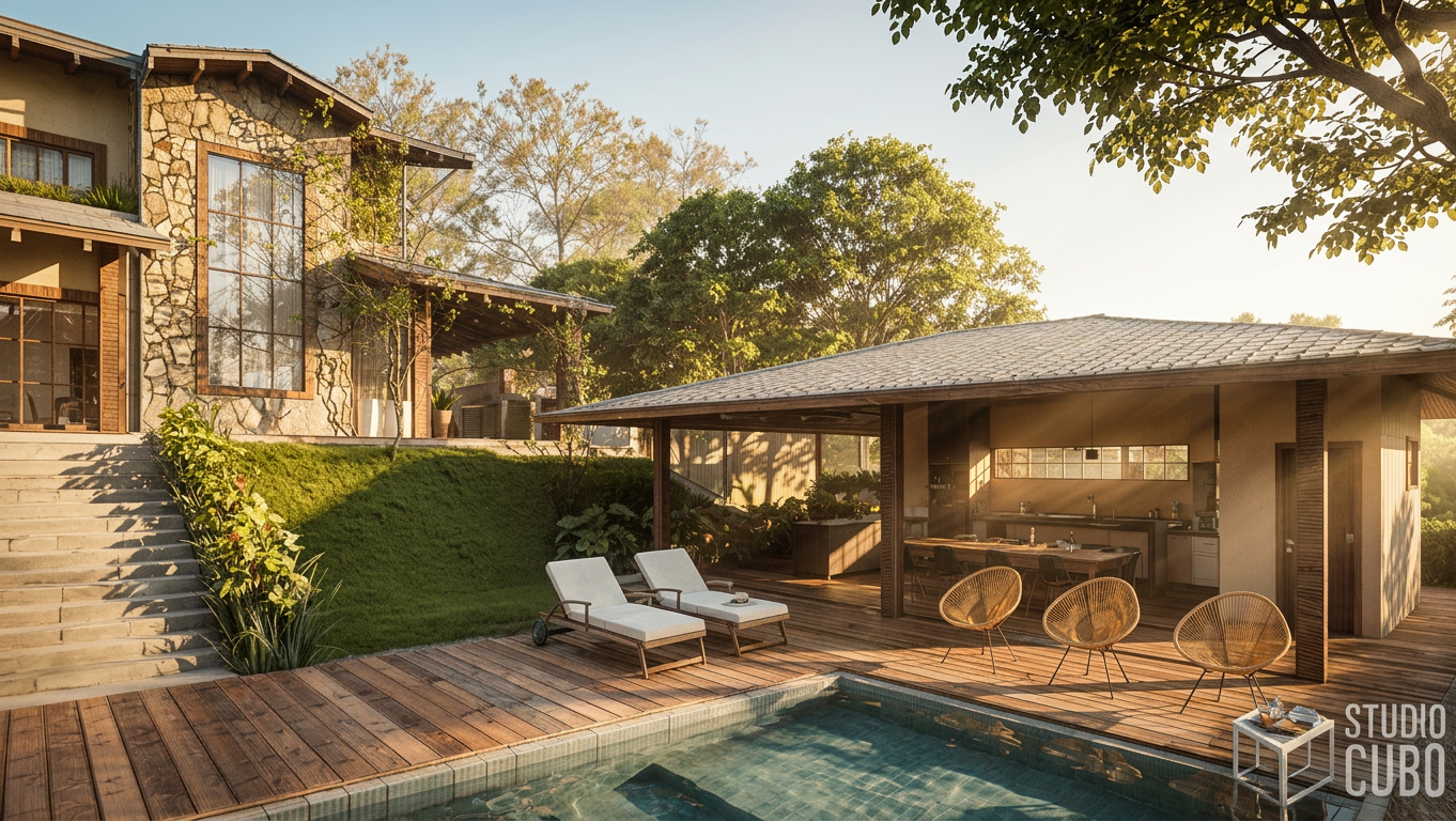 A Morada da Serra foi projetada para ser o plano de fundo de uma família que vem crescendo e prosperando. Contemplar a Serra de São José, brincar com os cachorros, tomar banho de piscina e fazer um belo churrasco em família são nobres funções para esse lar acolhedor. A casa leva uma estética rústica e contemporânea: o volume dos telhados aparentes, os grandes fechos verticais na fachada e o revestimento em pedra natural criam a interação com o entorno imediato.