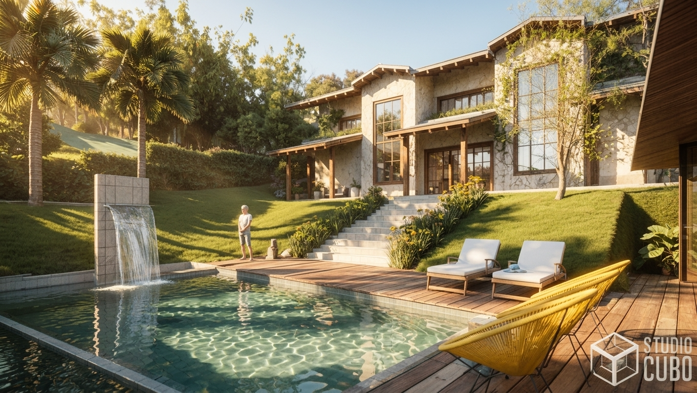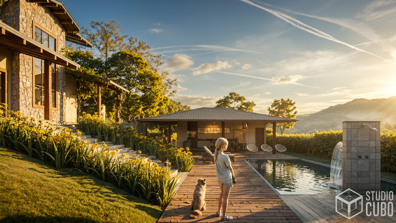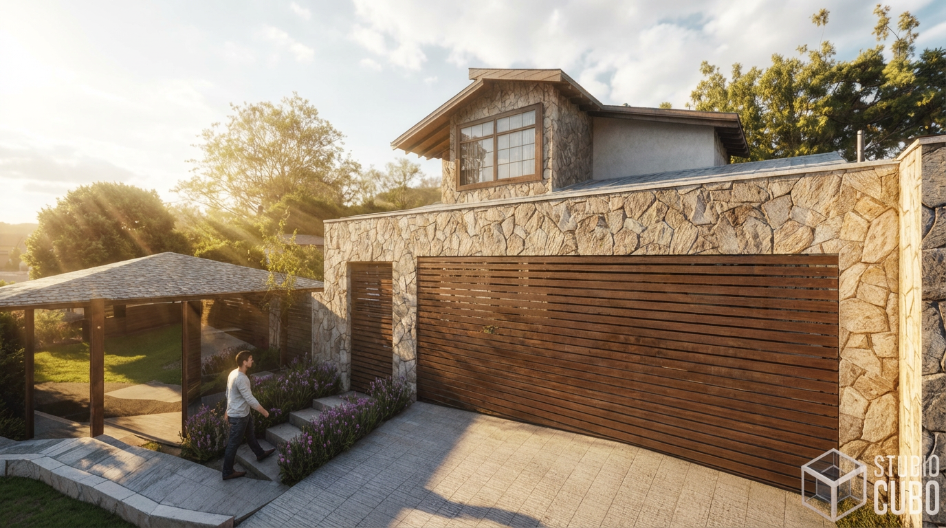 A Morada da Serra foi projetada para ser o plano de fundo de uma família que vem crescendo e prosperando. Contemplar a Serra de São José, brincar com os cachorros, tomar banho de piscina e fazer um belo churrasco em família são nobres funções para esse lar acolhedor. A casa leva uma estética rústica e contemporânea: o volume dos telhados aparentes, os grandes fechos verticais na fachada e o revestimento em pedra natural criam a interação com o entorno imediato.