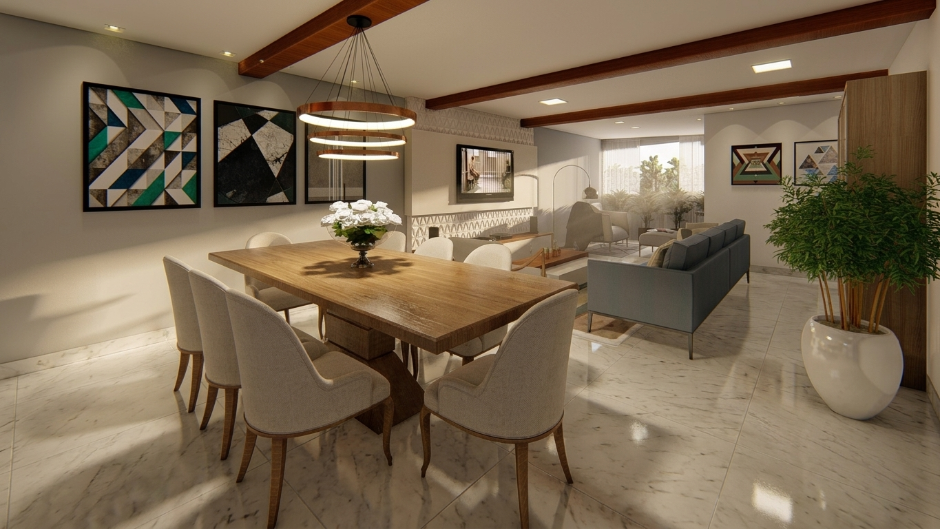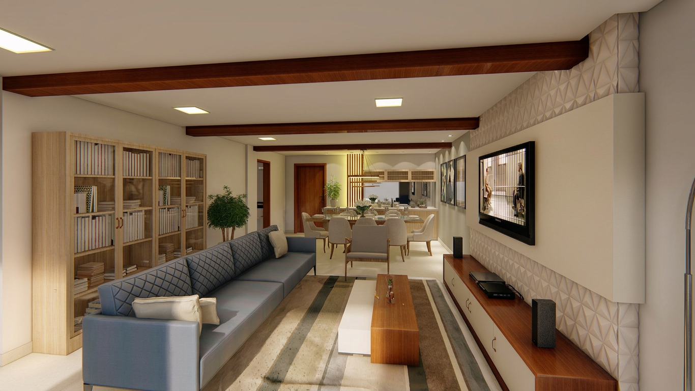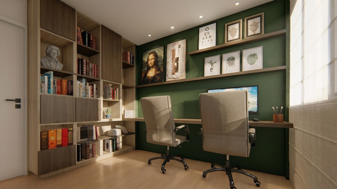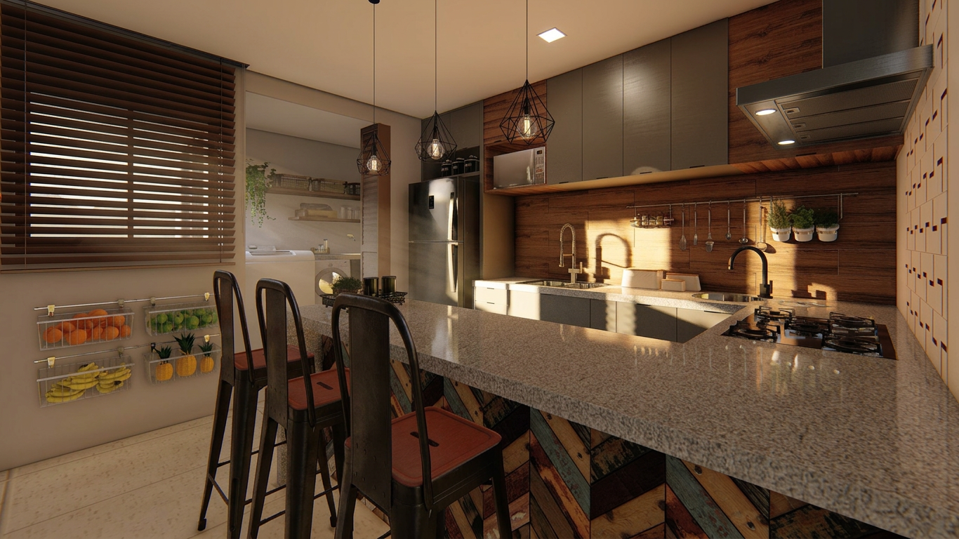 Reforma de apartamento para um casal de professores. O escritório integrado à suíte torna o histórico acervo literário inseparável deste casal. Cada vez mais disseminado na decoração contemporânea, o estilo industrial está presente no projeto. Para a cozinha foi levado o contraste entre materiais brutos aparentes e decoração sofisticada. Nesse ambiente, utilizamos o popular Granito Andorinha na bancada, porcelanato Chevron, porcelanato amadeirado Reserva Natural e azulejos, além de Armários mistos em MDF Espresso e Carvalho Natural.