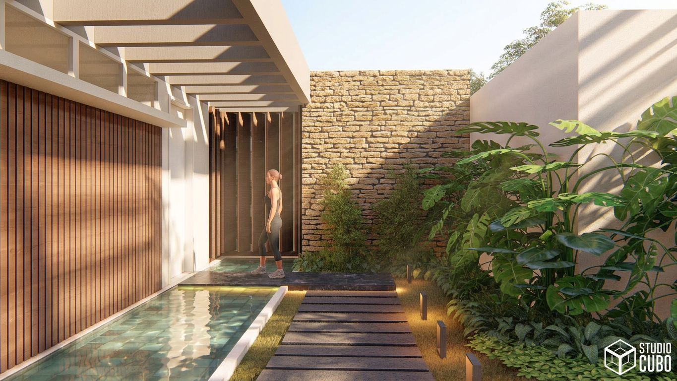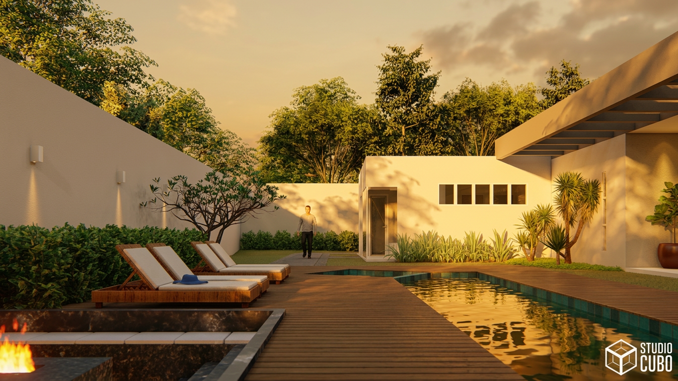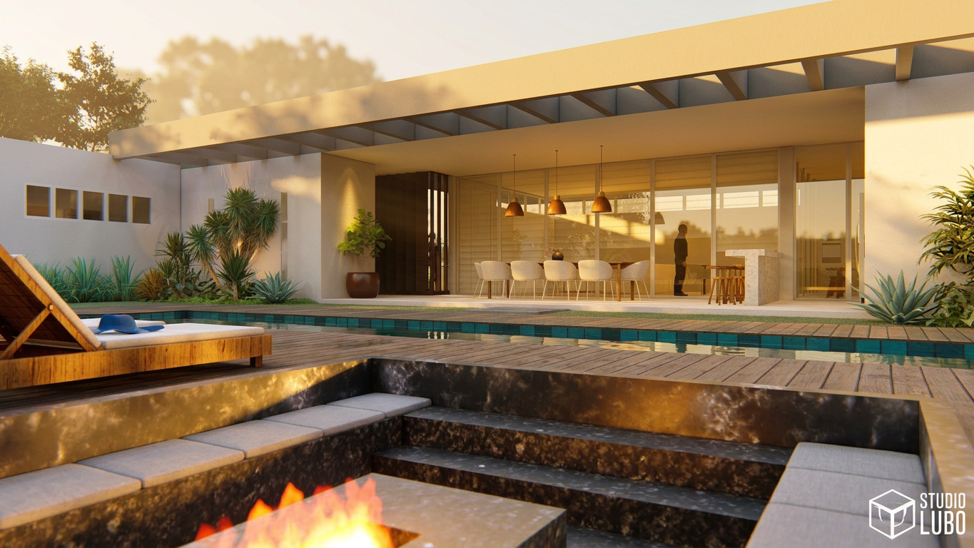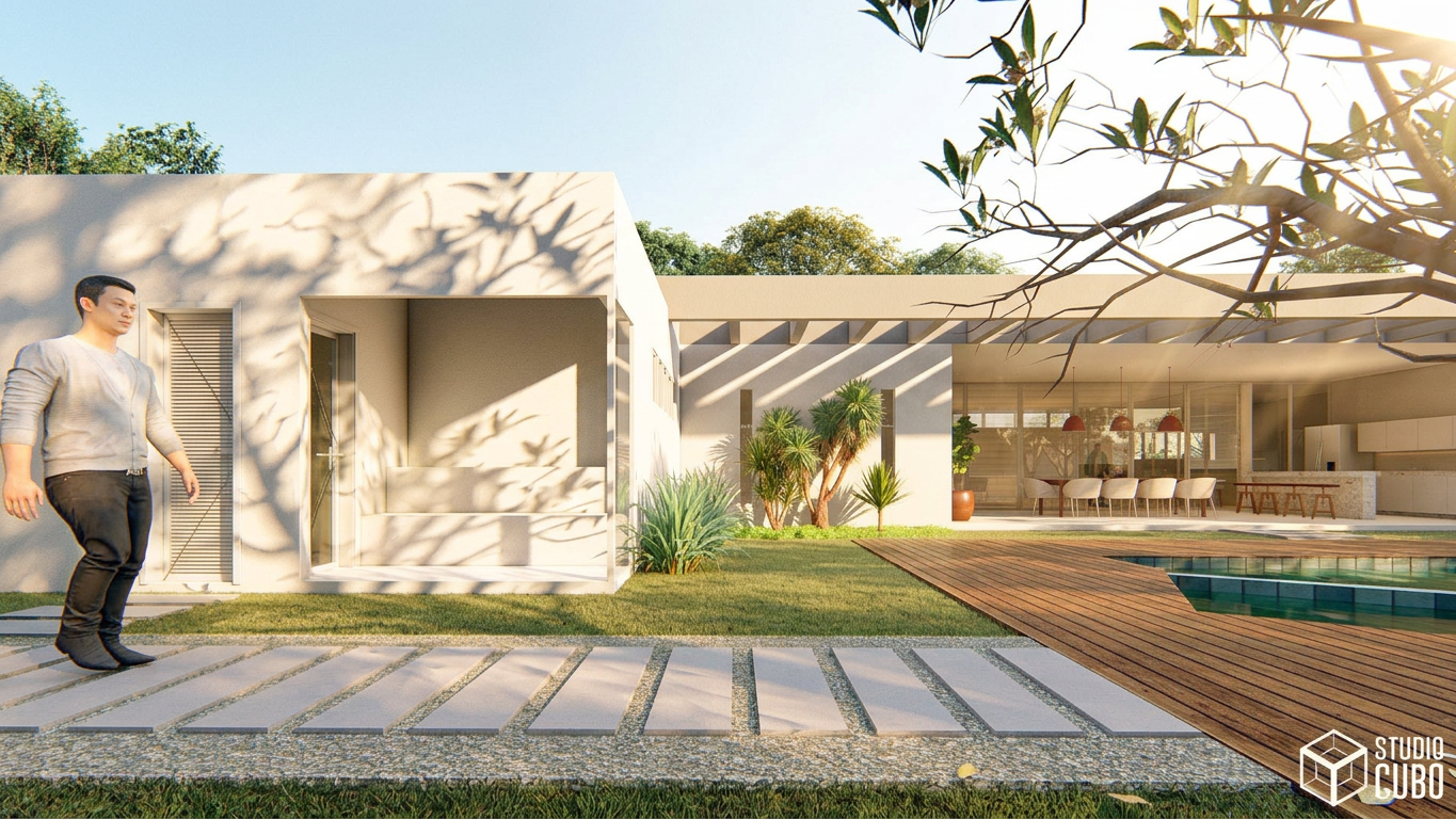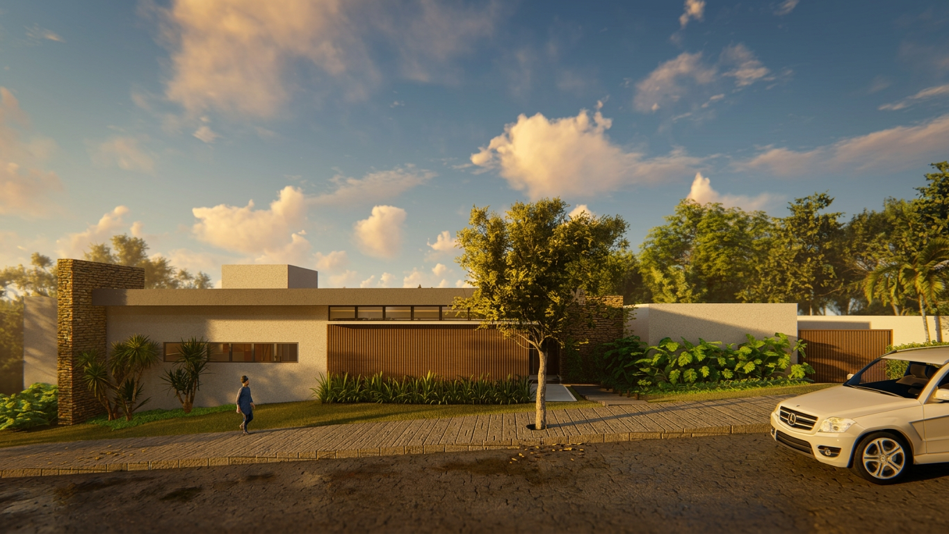 A concepção inicial do projeto consiste em respeitar a topografia do terreno, estabelecendo a garagem no nível inferior e o corpo principal da casa no térreo. Desta forma, desenvolvemos uma residência generosa setorizando assim, ao meio toda a parte social da casa, à esquerda toda a parte íntima e à direita os serviços. A casa tem como destaque 2 espaços especiais: a entrada (por onde o convidado é conduzido por um belo espelho d’água à porta principal) e a área gourmet (que é abraçada por um pergolado que une os blocos laterais.) A piscina em raia e o fogo de chão são inseridos em um grande deck amadeirado, reverenciando a nobreza deste espaço através dos ambientes e materiais.